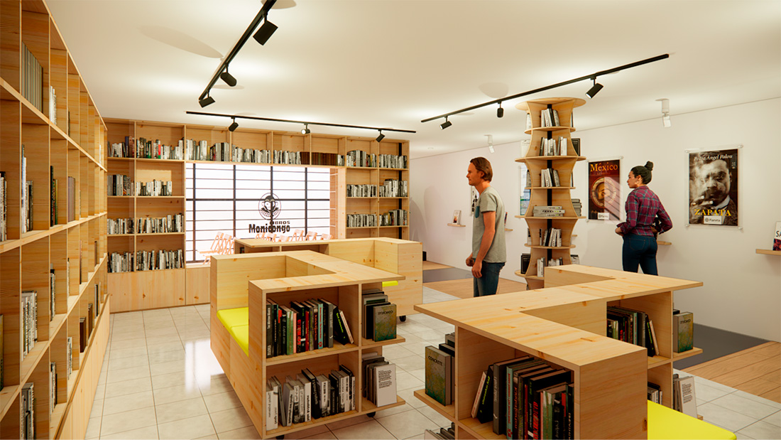 La Librería Monicongo surge como una propuesta cultural en su entorno, con el propósito de enriquecer a la comunidad local a través de la literatura y el arte, mientras desafía la homogeneidad de los bares que prevalecen en la zona. Este proyecto de remodelación fue concebido con la premisa fundamental de transformar el espacio arquitectónico en un cómplice activo, capaz de evocar una experiencia sensorial que fortalezca el vínculo sagrado entre el libro y el lector, una relación que, en su esencia, recuerda la épica unión de Don Quijote y Sancho Panza. Desde la fachada, se buscó que la Librería Monicongo se presentara con audacia, empleando un color amarillo vibrante que no solo la hace destacar en el paisaje urbano, sino que también sirve como un faro que atrae a los amantes de la cultura y la literatura. Este matiz cálido ilumina los anuncios, logrando que la fachada sea una invitación irresistible. En el interior, el espacio se propone, con una visión donde la librería se integrase con una pequeña cafetería, y que el espacio ofreciera un intercambio de conversaciones y reflexiones entre sus usuarios. Este rincón se convierte en un punto de encuentro, un lugar donde los libros son compañeros de mesa y la literatura es un alimento para el alma. Más allá de la cafetería, se desarrolló el área de venta de libros, donde un mobiliario central está diseñado con la intención de que el lector se siente, se sumerja en las páginas y se sumerja en la riqueza de las historias. A través de un corredor principal, la librería se conecta con un espacio de usos múltiples, un lienzo en blanco que puede albergar una variedad de eventos culturales, desde exposiciones de arte hasta círculos de lectura y conferencias. Este espacio versátil es un testimonio del compromiso de la Librería Monicongo con la diversidad cultural y su deseo de ser un faro de conocimiento y creatividad en la comunidad. En resumen, la Librería Monicongo es mucho más que una simple librería; es un santuario cultural que celebra la literatura y el arte, un espacio arquitectónico que busca ser un faro de conocimiento en un mar de entretenimiento efímero.